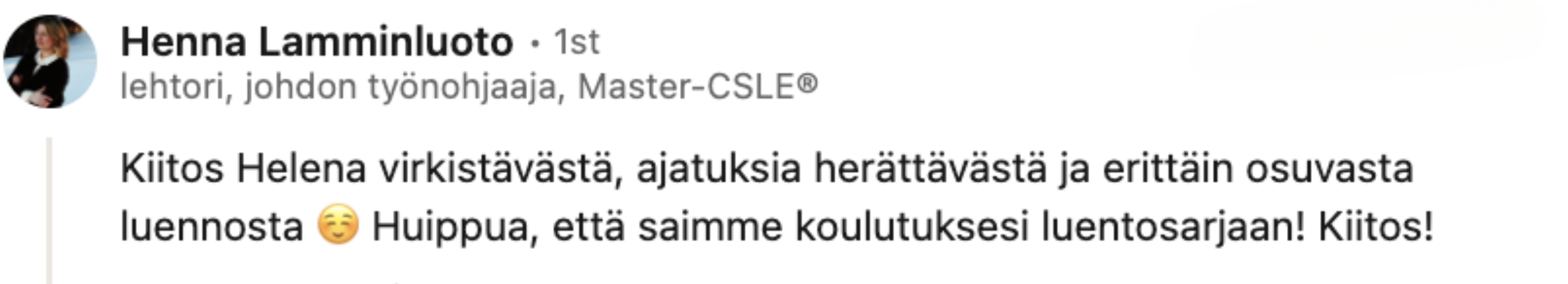 “Mainio puheenvuoro ja Helena on tyyppinä ja kouluttajana kyllä valoisa ja innostava.”